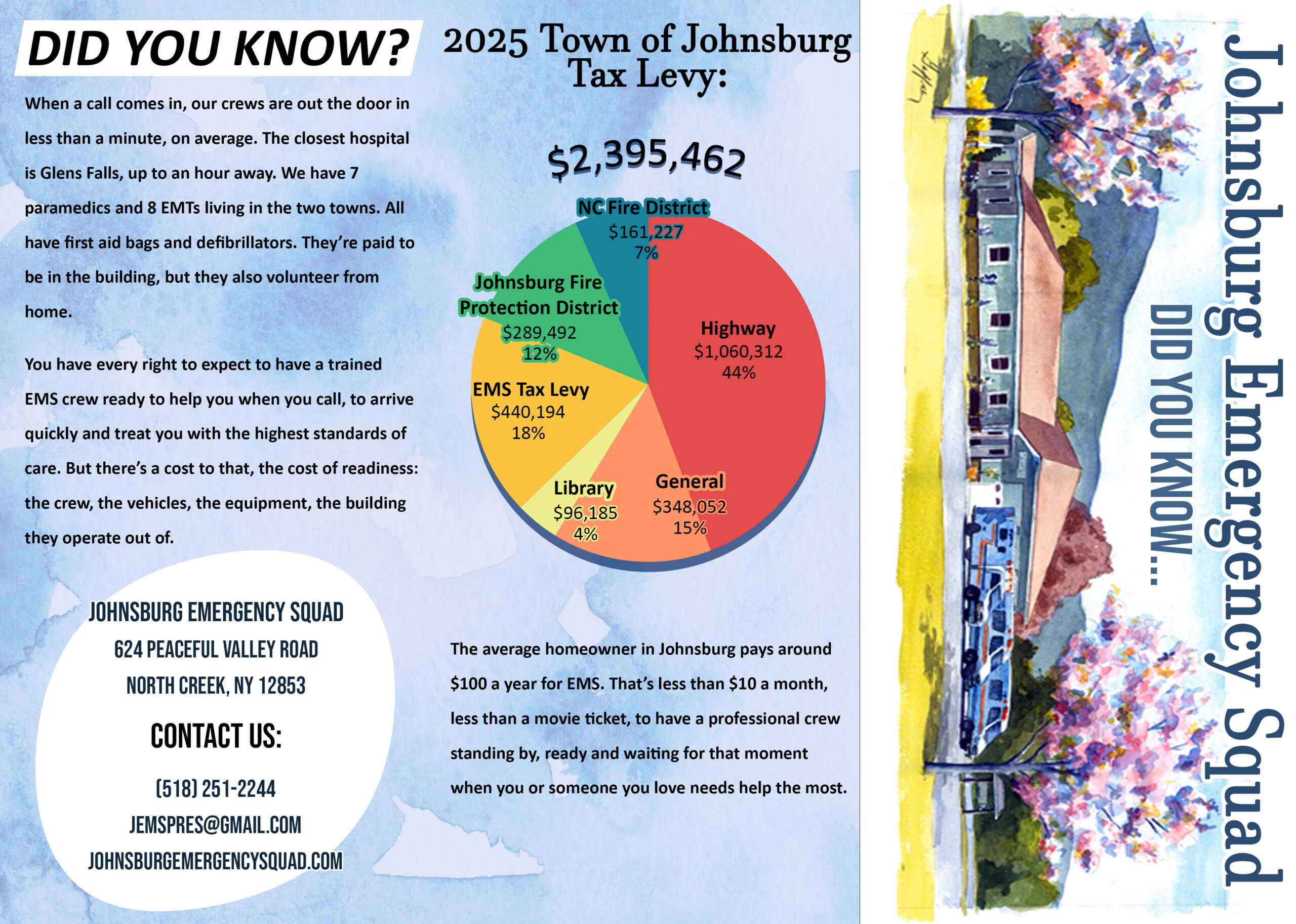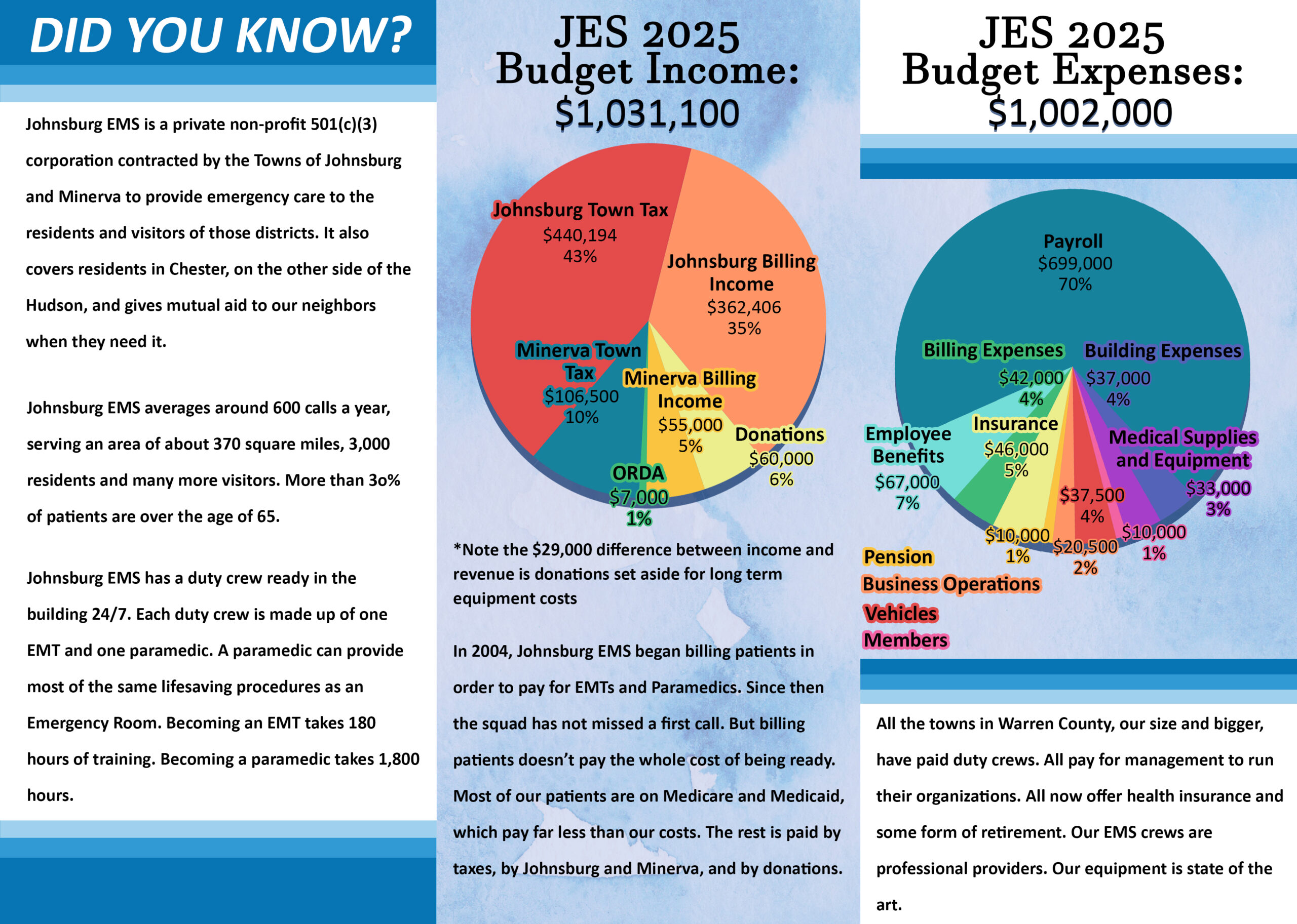 EMS Johnsburg Emergency Squad (JES) is a private, non-profit, charity organized for the public good. 100% of all funds generated by JES are used to operate an ambulance service within the community. It is also a business that operates 24/7. In November of 2014 the townspeople of Johnsburg passed an ambulance tax district. The money from the district allows the squad to now pay competitive salaries to its employees, and for the first time offer benefits. The squad now provides salaries to its operations manager and president. This year it was able to purchase a much needed third ambulance. All revenue generated from patient billing goes into the tax district, and can only be used for EMS. Each year the squad and the town board put together a budget based on revenue predictions and operational expenses. The tax district ensures that the squad will continue to provide quality and timely care far into the future.